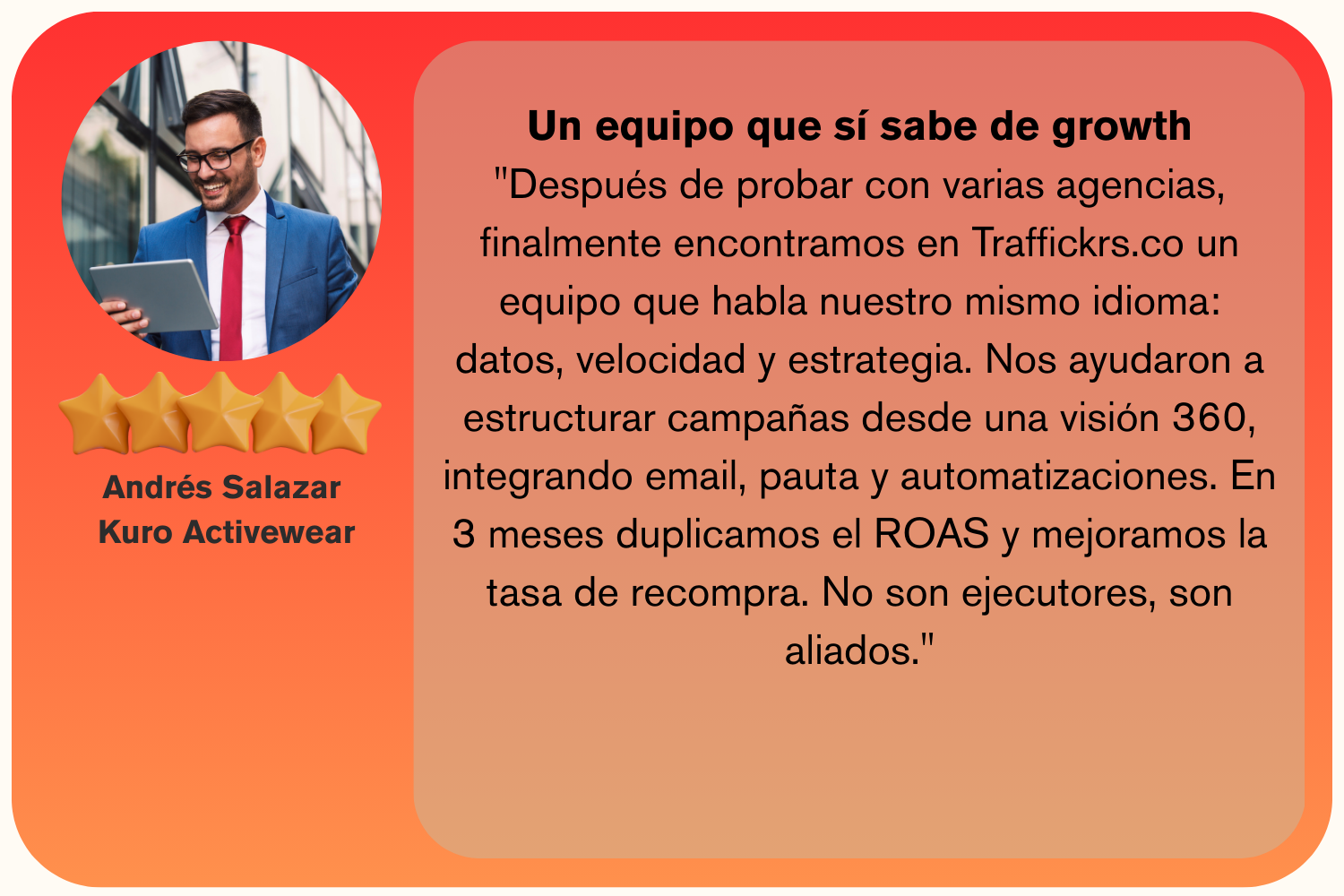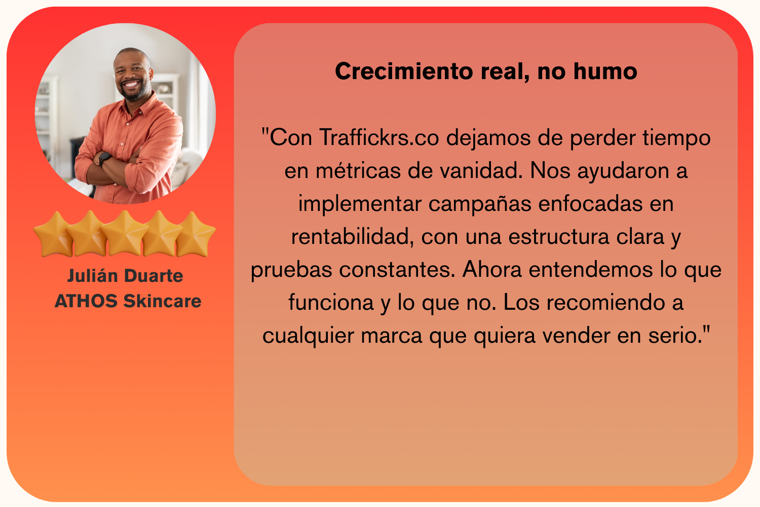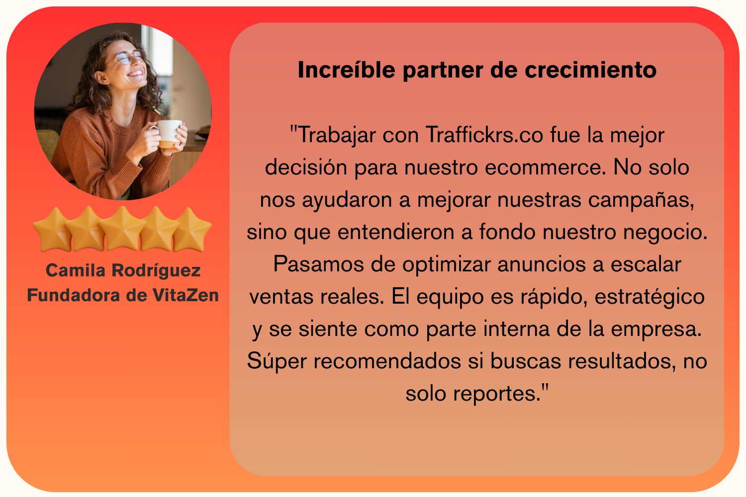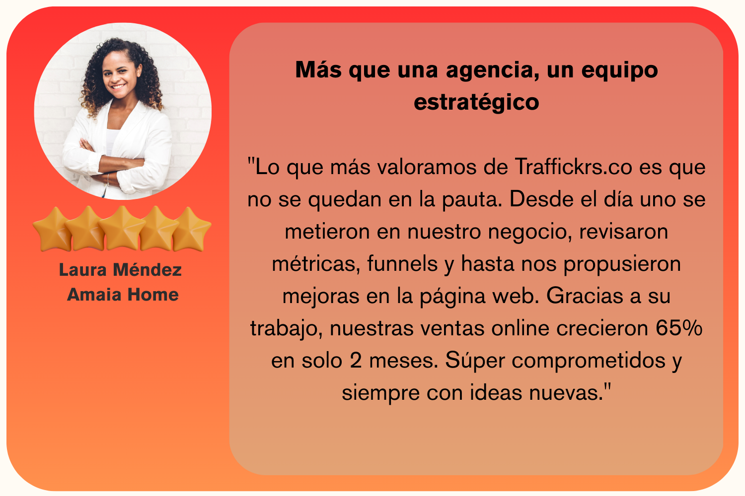 En Traffickrs.co conectamos estrategia, pauta digital y automatización para ayudarte a escalar tu ecommerce. Diseñamos campañas publicitarias que no solo generan tráfico, sino que convierten. Creamos flujos de email marketing que impulsan la recompra y fortalecen la relación con tus clientes. Y detrás de todo, una estrategia pensada para reducir costos de adquisición, mejorar la retención y construir una marca que crece con sentido y dirección.